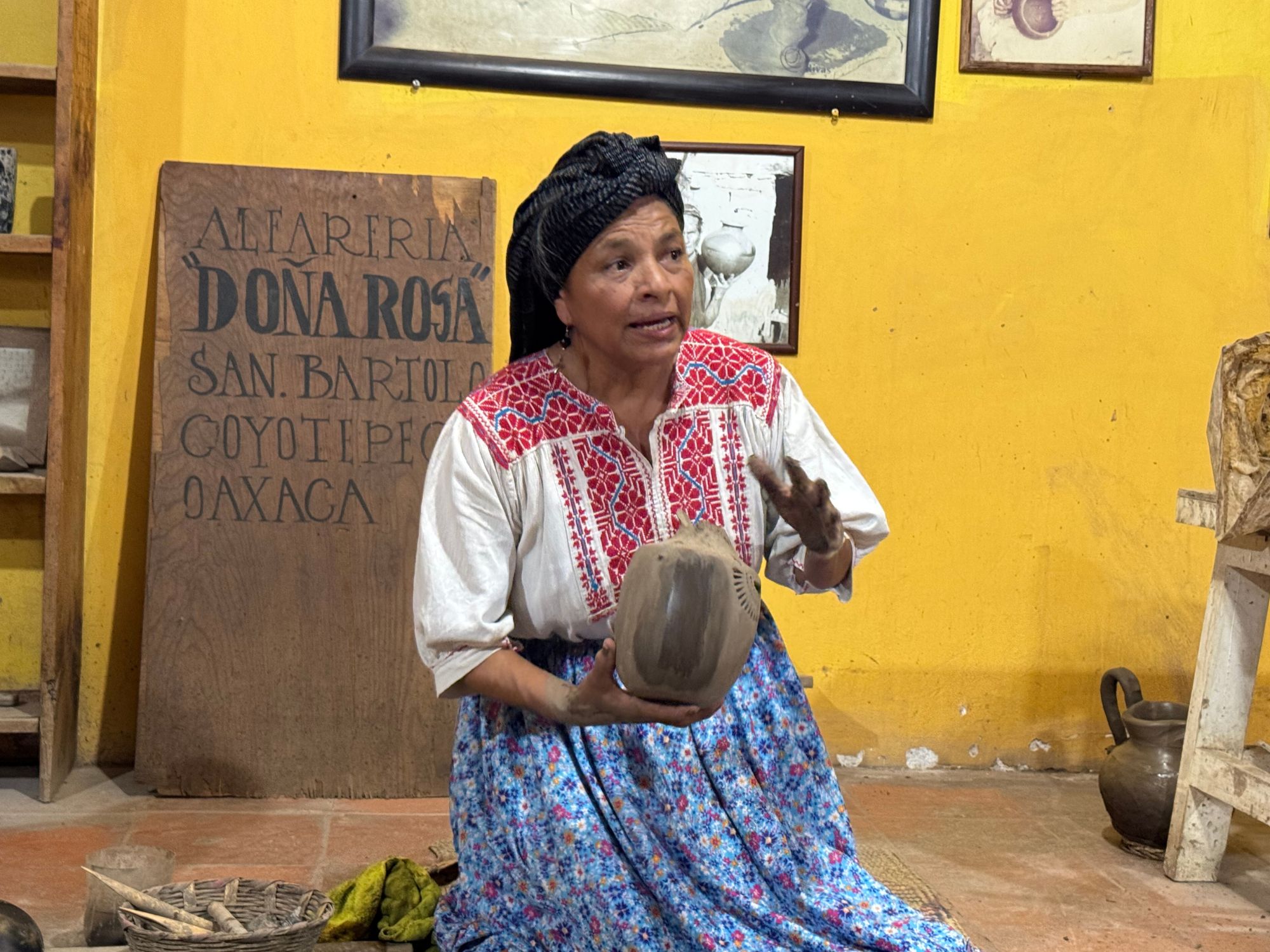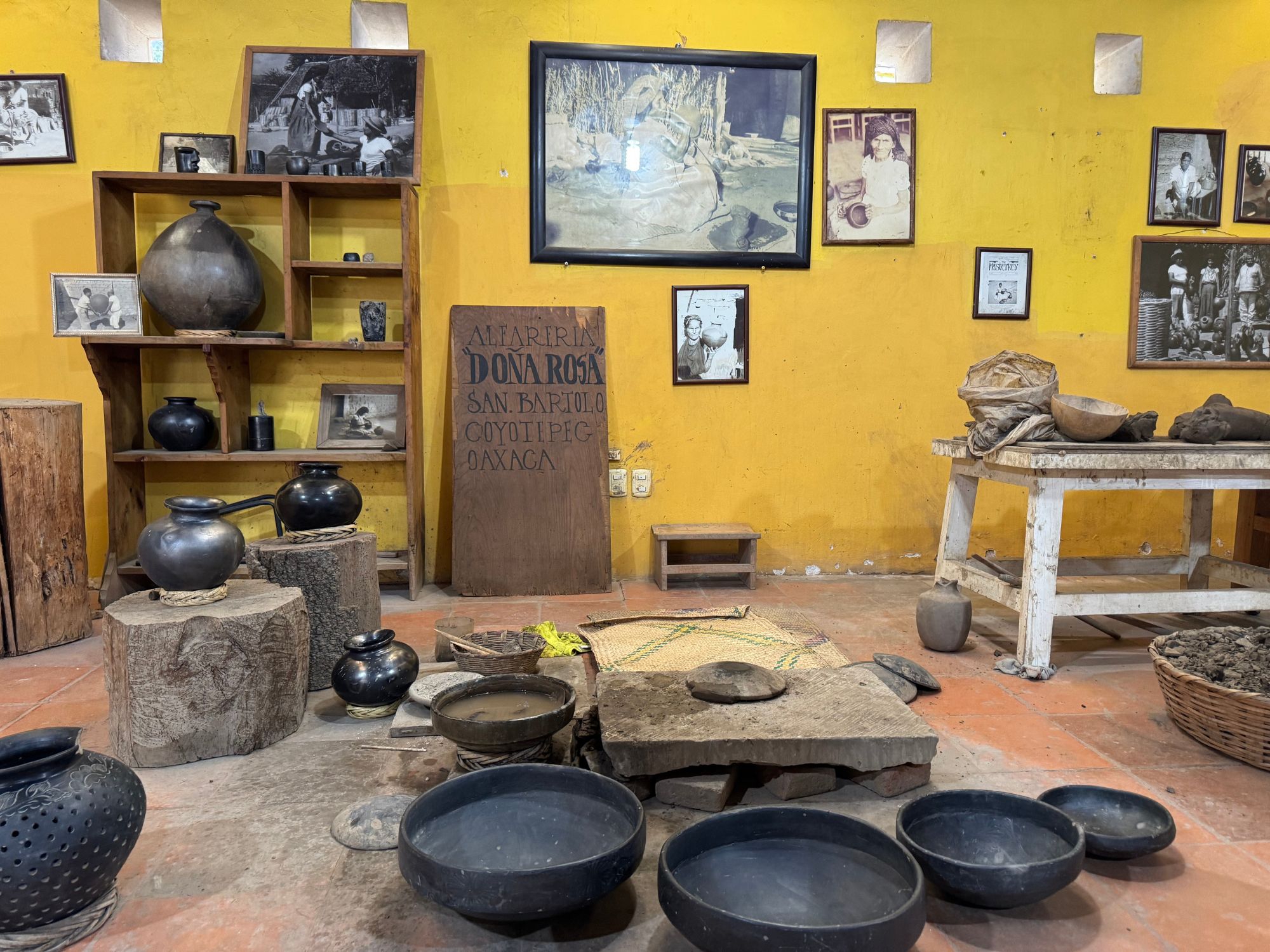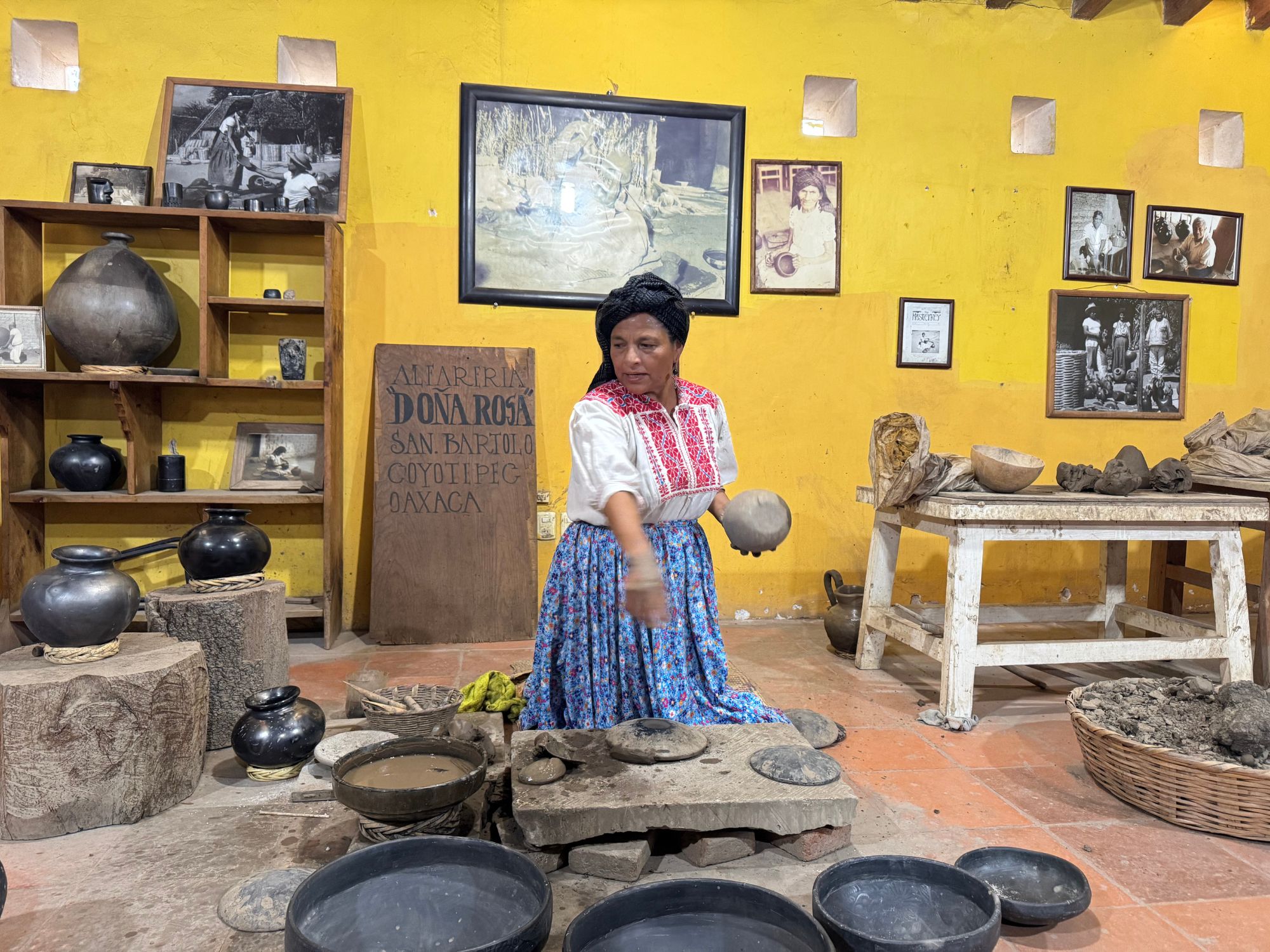 Our second stop is at Alfarería Doña Rosa, located in San Bartolo Coyotepec, Oaxaca. This workshop was founded by Doña Rosa Real Mateo de Nieto, who revolutionized the traditional black clay pottery, known as barro negro, by developing a technique that imparts a distinctive shine to the pieces.