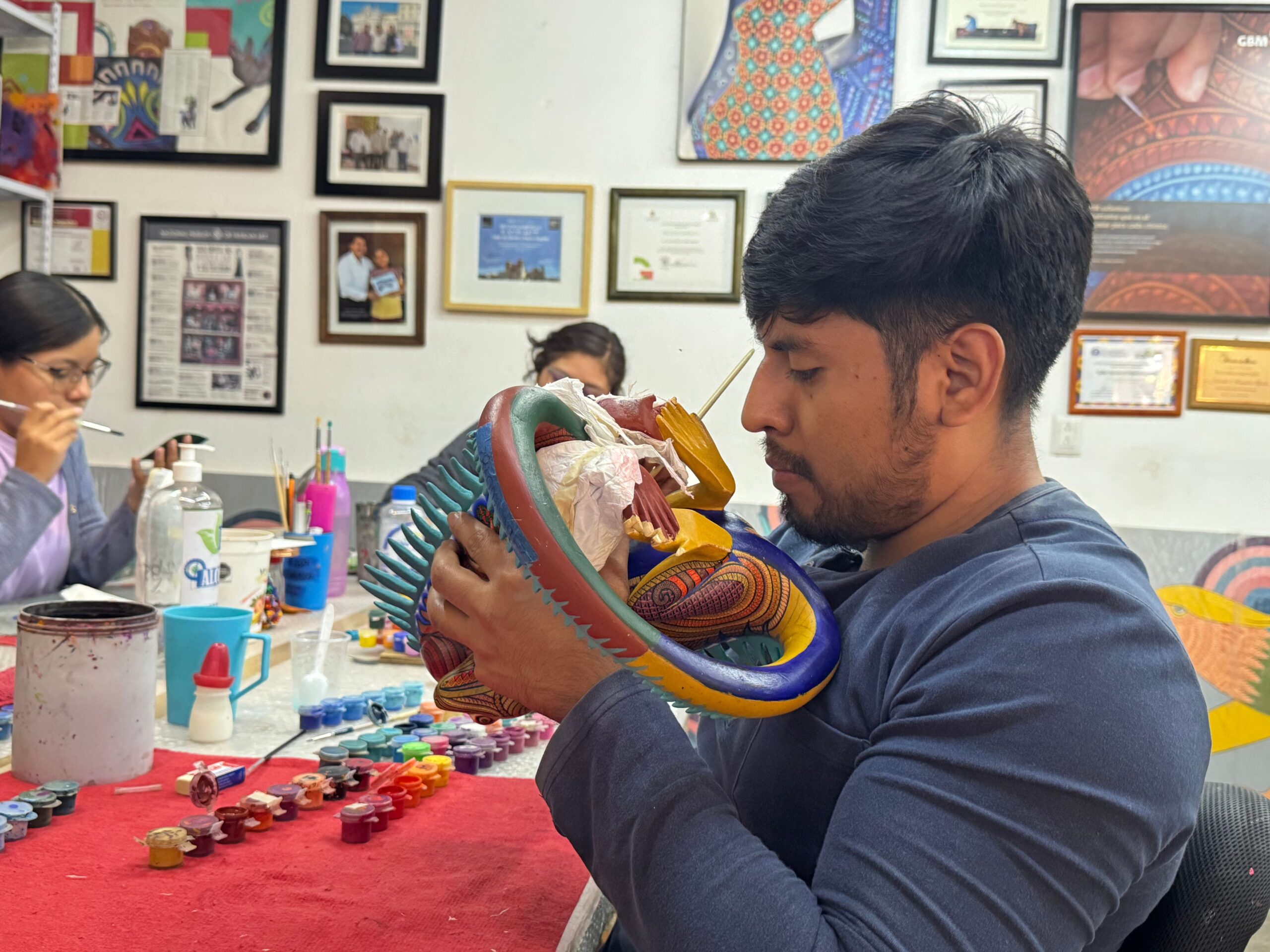 During the visit, you’ll have the chance to learn about the entire alebrije-making process, from selecting and carving the copal wood to applying intricate designs inspired by Zapotec iconography.