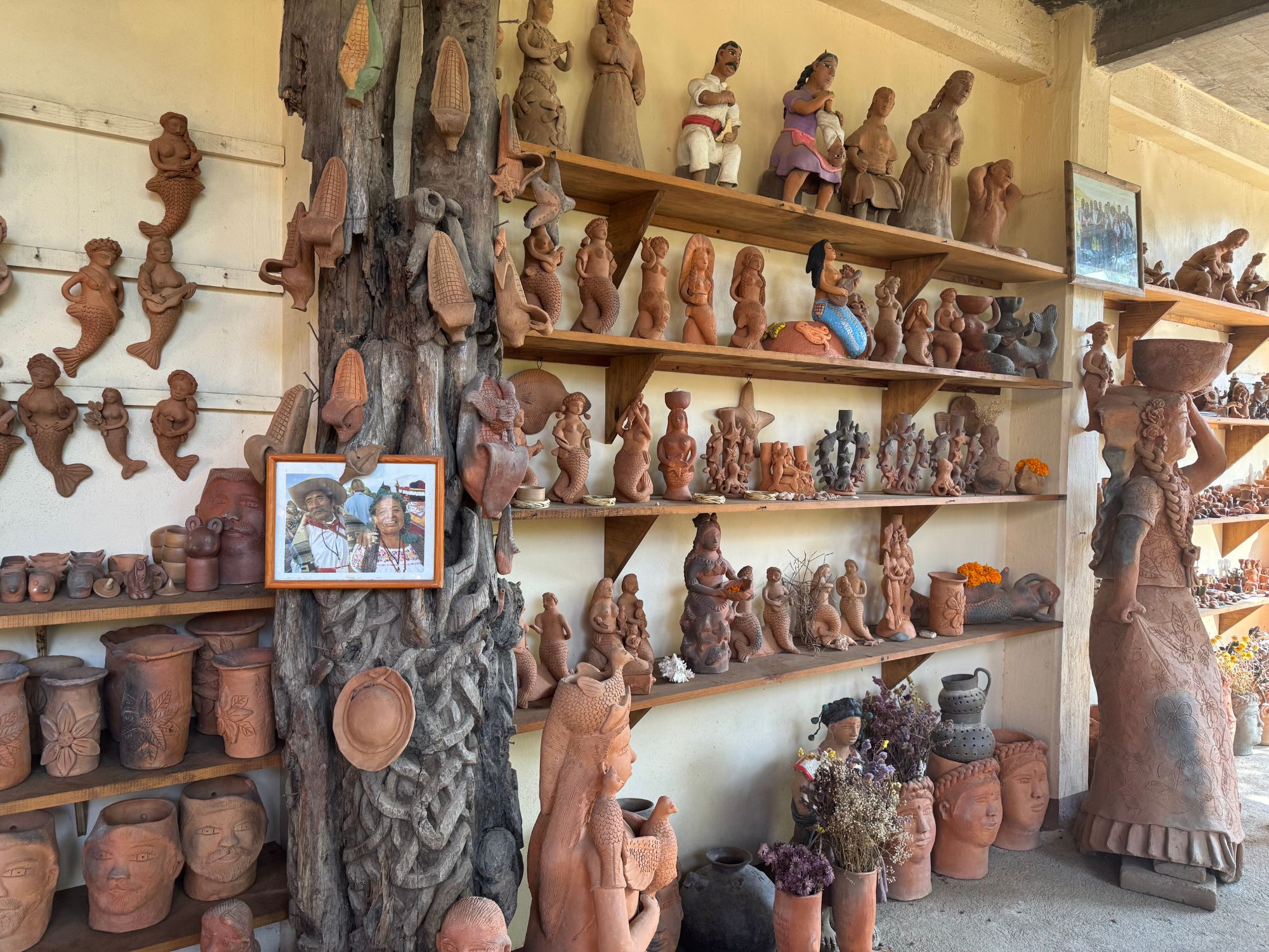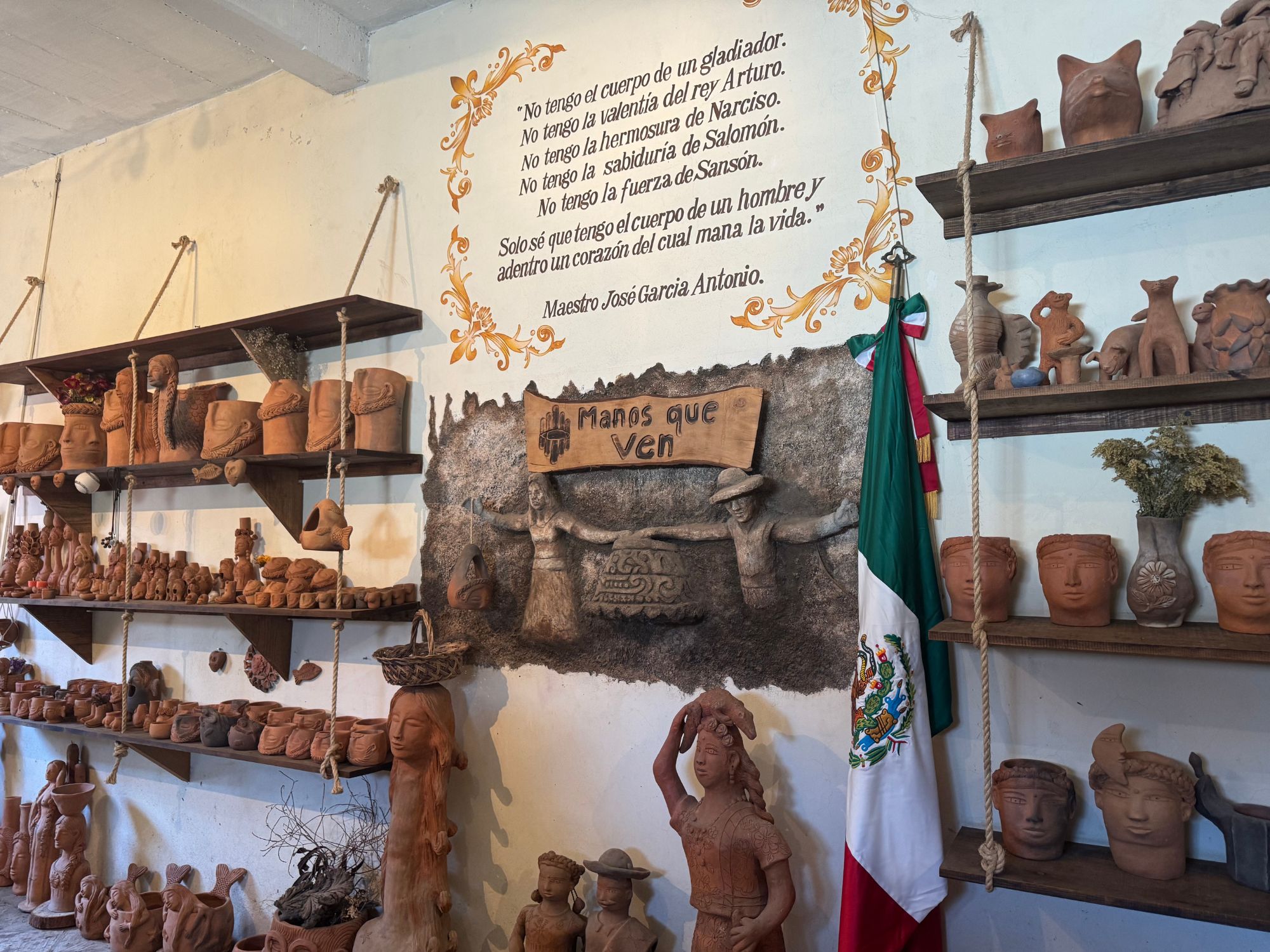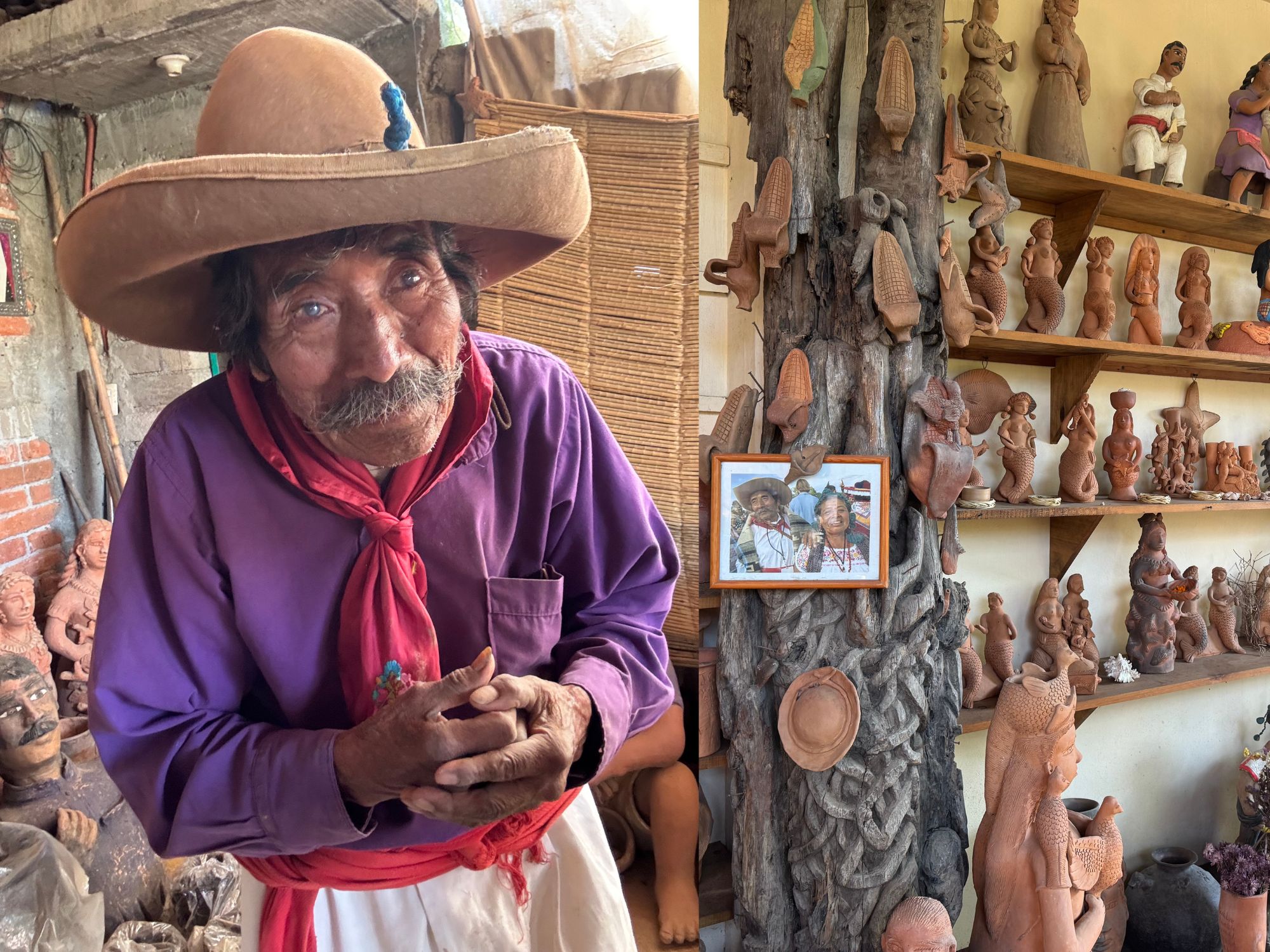 Manos que Ven” (Hands That See) is a renowned pottery workshop located in San Antonino Castillo Velasco, Oaxaca. It was founded by Maestro José García Antonio, a self-taught artisan who began working with clay at the age of seven. Despite losing his sight in his mid-50s due to glaucoma, Maestro García continued to create intricate clay sculptures, relying on his developed sense of touch. His works often feature large-scale human figures, including mermaids, which have earned him the nickname “El Señor de las Sirenas” (The Lord of the Mermaids).